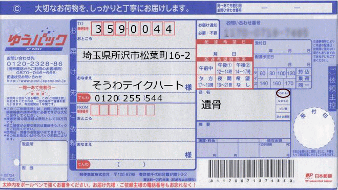 *ゆうパック以外は遺骨の配達を引き受けしてません。